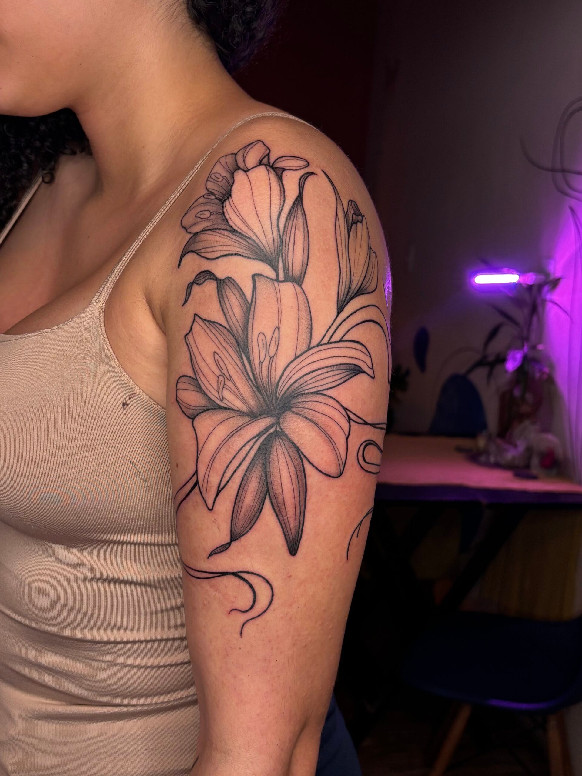 Tatuo vários estilos, dente eles os que mais se destacam são o fine line, ornamental, botânica e black work.